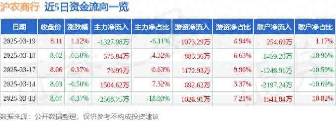 沪农商行(601825)3月19日主力资金净卖出1327.98万元