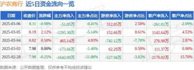 沪农商行(601825)3月6日主力资金净卖出51.05万元