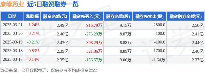 康缘药业融资融券信息显示,融资方面,当日融资买入3382.73万元,融资偿还2465.94万元,融资净买入916.79万元。融券方面,融券卖出6600.0股,融券偿还3800.0股,融券余量9.15万股,融券余额134.6万元。融资融券余额2.5亿元。