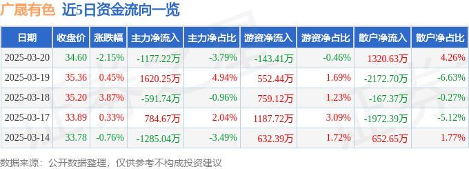 证券之星消息,截至2025年3月20日收盘,广晟有色(600259)报收于34.6元,下跌2.15%,换手率2.62%,成交量8.8万手,成交额3.1亿元。