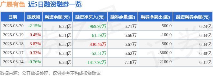 广晟有色融资融券信息显示,融资方面,当日融资买入3170.89万元,融资偿还4140.87万元,融资净偿还969.97万元。融券方面,融券卖出500.0股,融券偿还0.0股,融券余量6.71万股,融券余额232.17万元。融资融券余额6.24亿元。