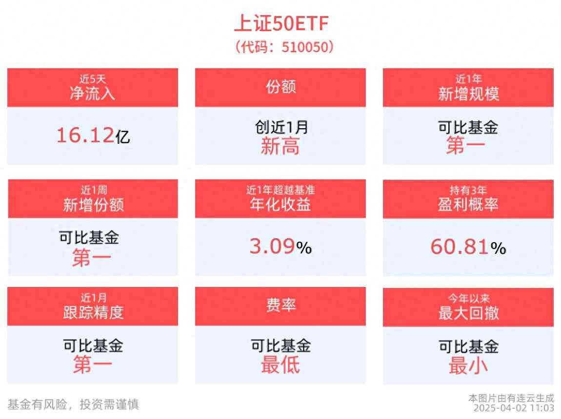 资金流入方面,上证50ETF最新资金净流入3.78亿元。拉长时间看,近5个交易日合计“吸金”16.12亿元。