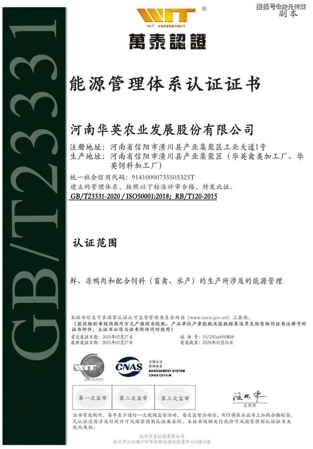 近日,华英农业顺利通过GB/T23331-2020/ISO50001:2018;RB/T120-2015能源管理体系认证并取得证书,标志着公司在现代企业能源管理的科学化、规范化和标准化方面已经达到了国际先进水平,这是对公司多年来一直坚持绿色生产、节能减排、有效利用能源的充分认可,也将为公司继续发挥行业引领示范作用、实现更高质量发展提供了重要的支持和保障作用。