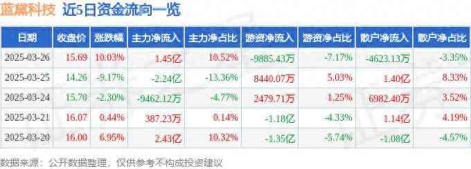 3月26日的资金流向数据方面,主力资金净流入1.45亿元,占总成交额10.52%,游资资金净流出9885.43万元,占总成交额7.17%,散户资金净流出4623.13万元,占总成交额3.35%。