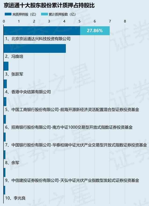截止本公告日,股东北京京运通达兴科技投资有限公司已累计质押股份1.95亿股,占其持股总数的27.86%。本次质押后京运通十大股东的累计质押股份占持股比例(占持股比例的计算以公司最新一期财务报表公布的十大股东的持股总数为基准)见下图:
