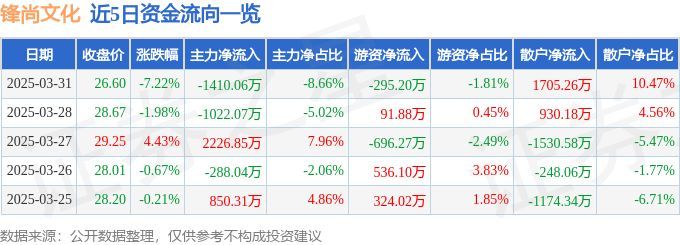 锋尚文化(300860)3月31日主力资金净卖出1410.06万元