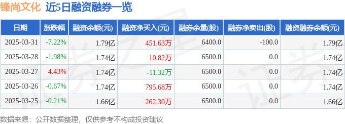 锋尚文化融资融券信息显示,融资方面,当日融资买入2270.57万元,融资偿还1818.94万元,融资净买入451.63万元。融券方面,融券卖出0.0股,融券偿还100.0股,融券余量6400.0股,融券余额17.02万元。融资融券余额1.79亿元。
