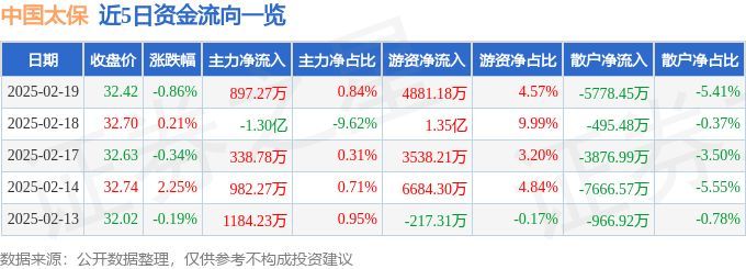 中国太保(601601)2月19日主力资金净买入897.27万元