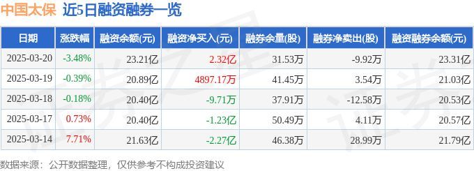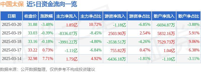 证券之星消息,截至2025年3月20日收盘,中国太保(601601)报收于31.88元,下跌3.48%,换手率0.79%,成交量53.75万手,成交额17.27亿元。