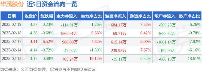 华茂股份(000850)2月19日主力资金净卖出114.91万元