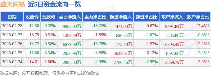 证券之星消息,截至2025年2月28日收盘,盛天网络(300494)报收于12.5元,下跌9.35%,换手率10.52%,成交量41.89万手,成交额5.44亿元。