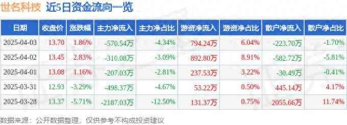 世名科技(300522)4月3日主力资金净卖出570.54万元