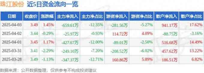 4月3日的资金流向数据方面,主力资金净流出659.61万元,占总成交额12.35%,游资资金净流出281.56万元,占总成交额5.27%,散户资金净流入941.17万元,占总成交额17.62%。