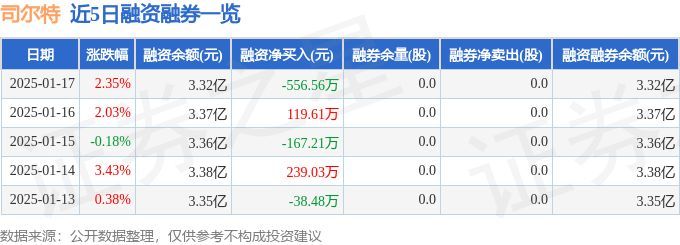 司尔特融资融券信息显示,融资方面,当日融资买入596.19万元,融资偿还1152.75万元,融资净偿还556.56万元。融券方面,融券卖出0.0股,融券偿还0.0股,融券余量0.0股,融券余额0.0万元。融资融券余额3.32亿元。