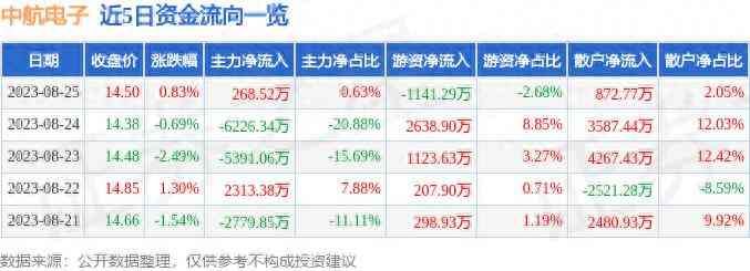 截至2023年8月25日收盘,中航电子(600372)报收于14.5元,上涨0.83%,换手率0.65%,成交量29.24万手,成交额4.25亿元。