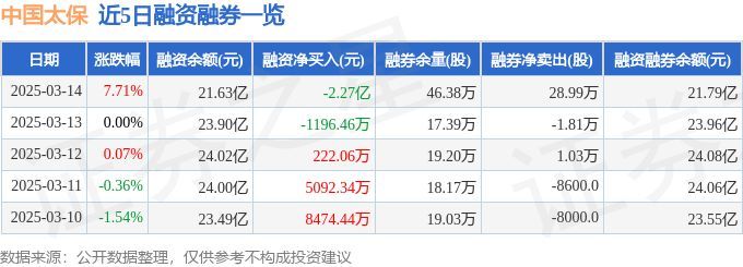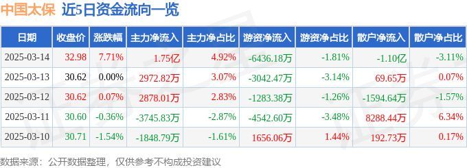 证券之星消息,截至2025年3月14日收盘,中国太保(601601)报收于32.98元,上涨7.71%,换手率1.61%,成交量110.25万手,成交额35.49亿元。