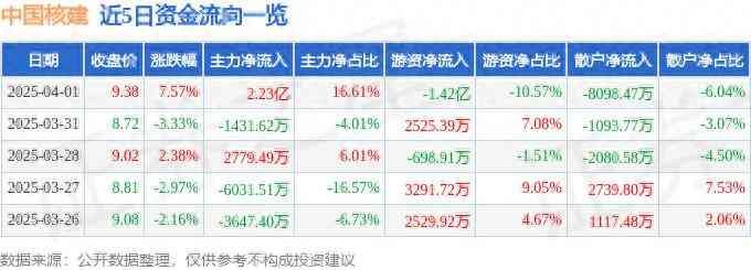 中国核建(601611)4月1日主力资金净买入2.23亿元