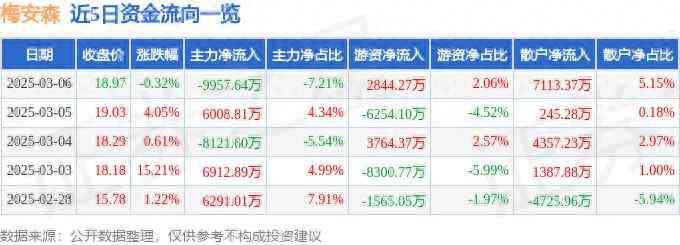 证券之星消息,截至2025年3月6日收盘,梅安森(300275)报收于18.97元,下跌0.32%,换手率28.14%,成交量71.78万手,成交额13.82亿元。