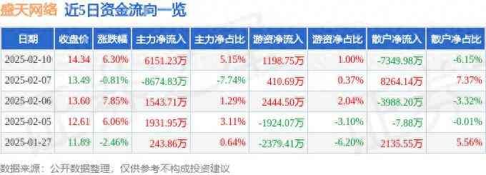 盛天网络(300494)2月10日主力资金净买入6151.23万元