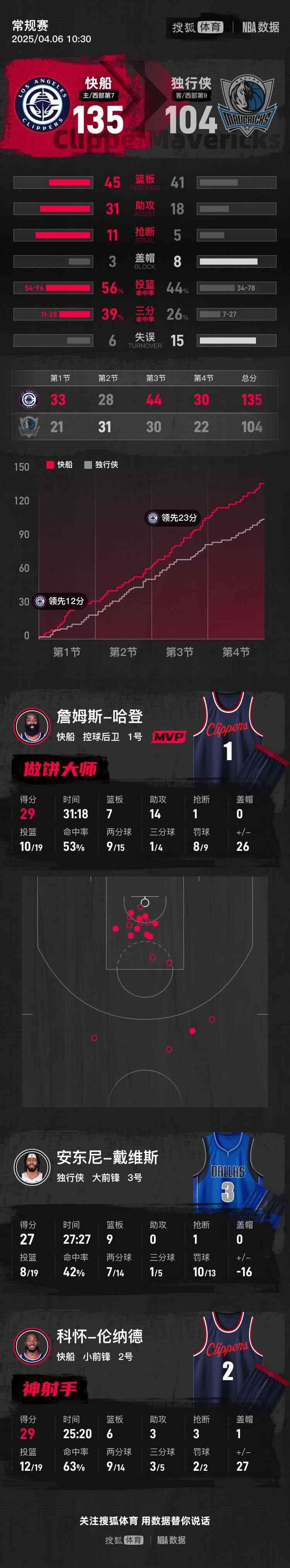 【搜狐体育战报】北京时间4月6日NBA常规赛,主场作战的快船以135-104击败独行侠,快船取得4连胜。哈登29分7篮板14助攻,戴维斯27分9篮板0助攻。