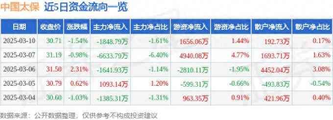 中国太保(601601)3月10日主力资金净卖出1848.79万元