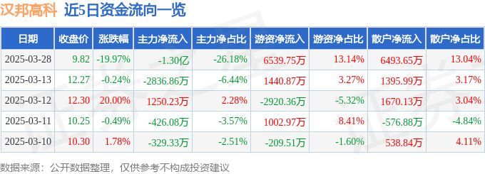 证券之星消息,截至2025年3月28日收盘,汉邦高科(300449)报收于9.82元,下跌19.97%,跌停,换手率16.75%,成交量49.63万手,成交额4.98亿元。