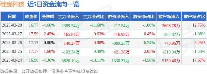 证券之星消息,截至2025年3月28日收盘,硅宝科技(300019)报收于16.77元,下跌4.66%,换手率3.47%,成交量12.0万手,成交额2.04亿元。