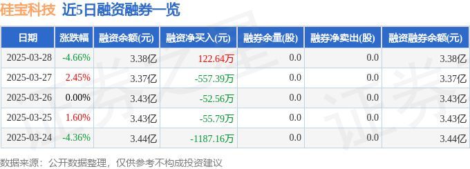 硅宝科技融资融券信息显示,融资方面,当日融资买入2152.63万元,融资偿还2029.99万元,融资净买入122.64万元。融券方面,融券卖出0.0股,融券偿还0.0股,融券余量0.0股,融券余额0.0万元。融资融券余额3.38亿元。