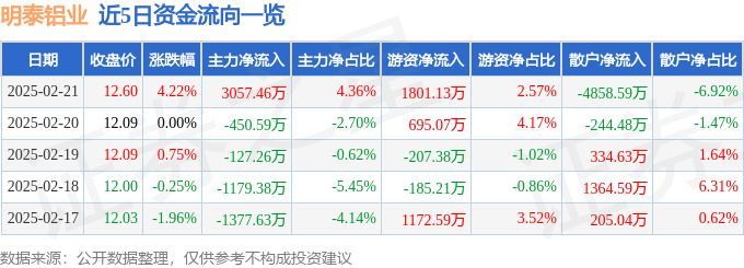 明泰铝业(601677)2月21日主力资金净买入3057.46万元