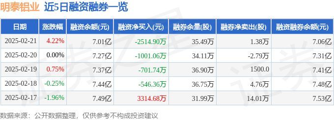 证券之星消息,截至2025年2月21日收盘,明泰铝业(601677)报收于12.6元,上涨4.22%,换手率4.69%,成交量55.96万手,成交额7.02亿元。