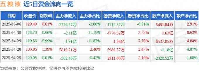证券之星消息,截至2025年5月6日收盘,五 粮 液(000858)报收于129.49元,上涨0.61%,换手率0.38%,成交量14.63万手,成交额18.89亿元。