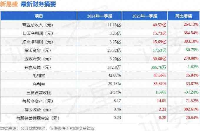 据证券之星公开数据整理,近期新易盛(300502)发布2025年一季报。截至本报告期末,公司营业总收入40.52亿元,同比上升264.13%,归母净利润15.73亿元,同比上升384.54%。按单季度数据看,第一季度营业总收入40.52亿元,同比上升264.13%,第一季度归母净利润15.73亿元,同比上升384.54%。本报告期新易盛应收账款上升,应收账款同比增幅达270.08%。