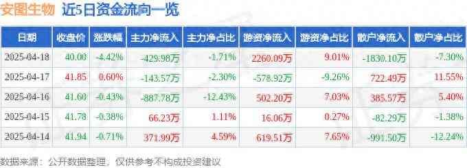 证券之星消息,截至2025年4月18日收盘,安图生物(603658)报收于40.0元,下跌4.42%,换手率1.09%,成交量6.26万手,成交额2.51亿元。
