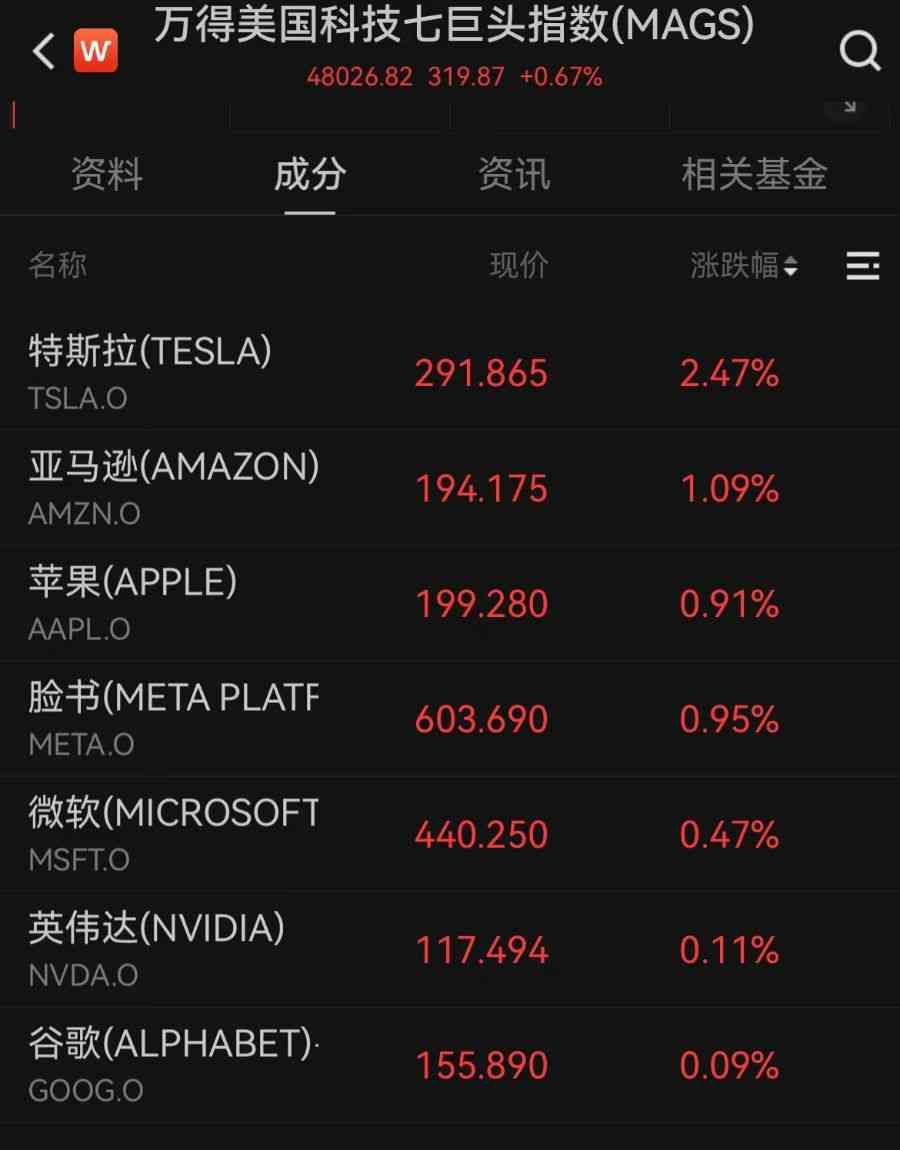 美国科技七巨头集体上涨。特斯拉涨超2%;亚马逊涨超1%;苹果、脸书、微软、英伟达、谷歌分别上涨0.91%、0.95%、0.47%、0.11%、0.09%。