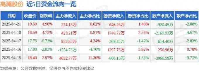 高澜股份(300499)4月21日主力资金净买入274.18万元
