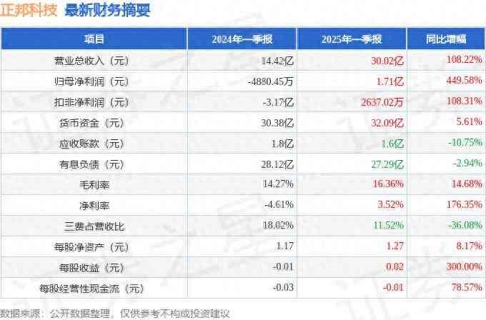 据证券之星公开数据整理,近期正邦科技(002157)发布2025年一季报。截至本报告期末,公司营业总收入30.02亿元,同比上升108.22%,归母净利润1.71亿元,同比上升449.58%。按单季度数据看,第一季度营业总收入30.02亿元,同比上升108.22%,第一季度归母净利润1.71亿元,同比上升449.58%。本报告期正邦科技盈利能力上升,毛利率同比增幅14.68%,净利率同比增幅176.35%。