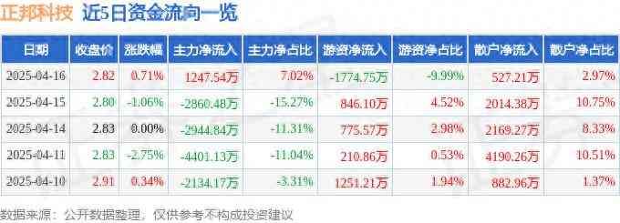 证券之星消息,截至2025年4月16日收盘,正邦科技(002157)报收于2.82元,上涨0.71%,换手率0.89%,成交量63.56万手,成交额1.78亿元。