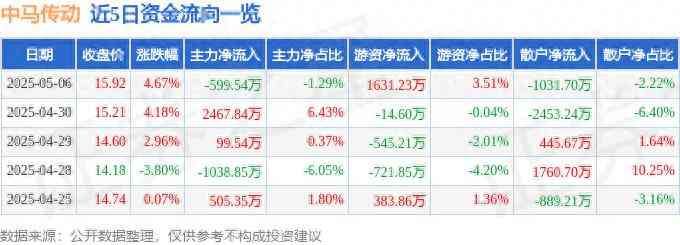 证券之星消息,截至2025年5月6日收盘,中马传动(603767)报收于15.92元,上涨4.67%,换手率9.67%,成交量29.85万手,成交额4.64亿元。
