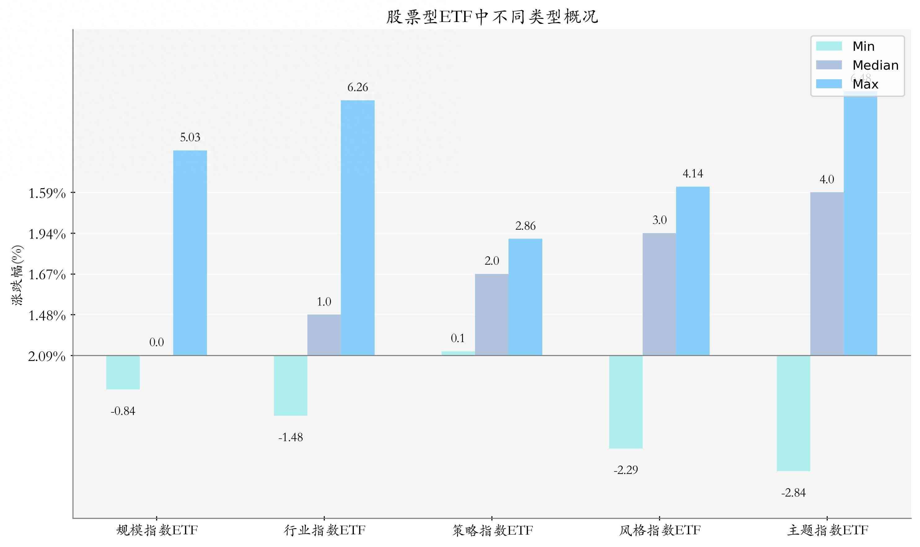 上周股票型ETF周度收益率中位数为1.82%。其中按照不同分类,规模指数ETF中富国创业板50ETF周度收益率最高,为5.03%;行业指数ETF中永赢国证商用卫星通信产业ETF周度收益率最高,为6.26%;策略指数ETF中嘉实中证锐联基本面50ETF周度收益率最高,为2.86%;风格指数ETF中易方达创业板成长ETF周度收益率最高,为4.14%;主题指数ETF中永赢国证通用航空产业ETF周度收益率最高,为6.48%。