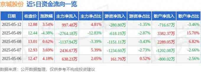 京城股份(600860)5月12日主力资金净买入997.48万元