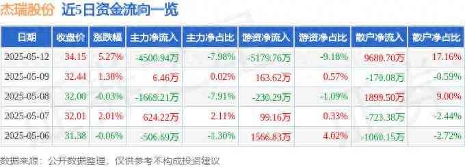 杰瑞股份(002353)5月12日主力资金净卖出4500.94万元