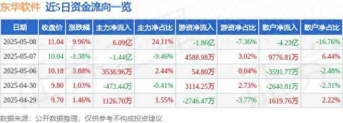 5月8日的资金流向数据方面,主力资金净流入6.09亿元,占总成交额24.11%,游资资金净流出1.86亿元,占总成交额7.36%,散户资金净流出4.23亿元,占总成交额16.76%。