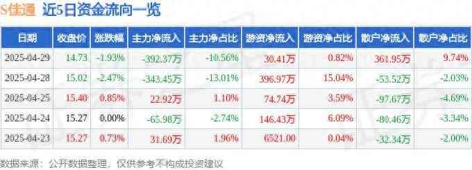 证券之星消息,截至2025年4月29日收盘,S佳通(600182)报收于14.73元,下跌1.93%,换手率1.47%,成交量2.49万手,成交额3714.75万元。