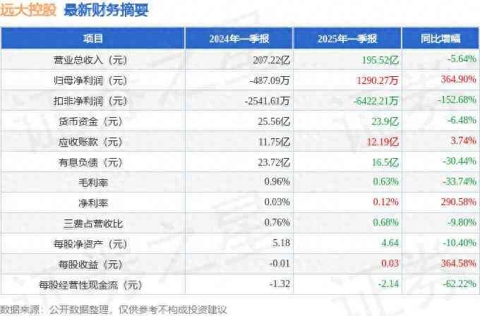 据证券之星公开数据整理,近期远大控股(000626)发布2025年一季报。根据财报显示,远大控股净利润增364.9%。截至本报告期末,公司营业总收入195.52亿元,同比下降5.64%,归母净利润1290.27万元,同比上升364.9%。按单季度数据看,第一季度营业总收入195.52亿元,同比下降5.64%,第一季度归母净利润1290.27万元,同比上升364.9%。