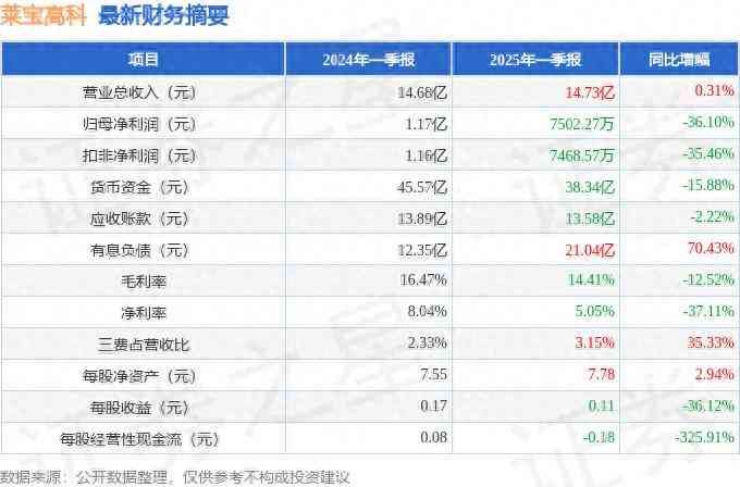 货币资金变动幅度为-11.81%,原因:本报告期公司支付到期LCM等材料款及控股子公司莱宝显示预付设备采购款。其他应收款变动幅度为-34.25%,原因:本报告期全资子公司重庆莱宝收回重庆莱宝产业园C区、D区工程建设缴交的农民工保证金。存货变动幅度为-14.91%,原因:公司上年末集中生产备货、本报告期实现销售。其他非流动资产变动幅度为26.95%,原因:控股子公司莱宝显示预付设备采购款。应付账款变动幅度为-26.56%,原因:本报告期支付到期LCM的材料采购款(上年末集中生产备货相应大量采购的LCM等材料于本季度到期付款)。长期应付职工薪酬变动幅度为-30.16%,原因:本报告期发放中长期激励基金。营业收入变动幅度为0.31%,原因:本报告期车载盖板玻璃产品的销量比上年同期增加、全贴合产品销售收入比上年同期有所下降。营业成本变动幅度为2.79%,原因:本报告期产品产销结构变化、高毛利率产品的销售份额有所下降导致销售成本增加。信用减值损失变动幅度为241.91%,原因:本报告期转回预期信用损失而上年同期为计提预期信用损失。营业外收入变动幅度为-89.44%,原因:本报告期收到供应商索赔款减少。营业外支出变动幅度为-93.43%,原因:本报告期报废处理固定资产损失减少。所得税费用变动幅度为-95.11%,原因:本报告期公司实现利润总额减少。归属于上市公司股东的净利润变动幅度为-36.1%,原因:本报告期销售毛利同比减少及研发费用等期间费用同比增加。经营活动产生的现金流量净额变动幅度为-325.91%,原因:本报告期支付LCM等材料采购款同比大幅增加。投资活动产生的现金流量净额变动幅度为-976.99%,原因:本报告期控股子公司莱宝显示预付设备采购款。筹资活动产生的现金流量净额变动幅度为-100.09%,原因:上年同期控股子公司莱宝显示收到其他股东投资款150,000.00万元。证券之星价投圈财报分析工具显示: