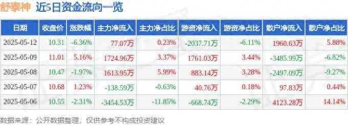 舒泰神(300204)5月12日主力资金净买入77.07万元