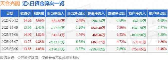 天合光能(688599)5月12日主力资金净买入851.86万元