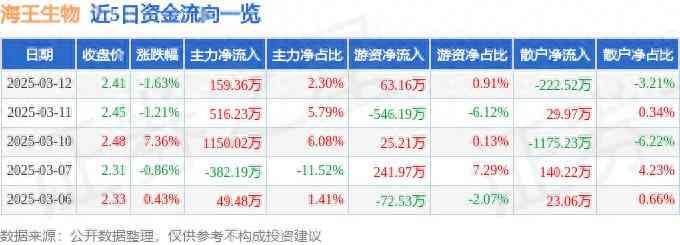 证券之星消息,截至2025年3月12日收盘,海王生物(000078)报收于2.41元,下跌1.63%,换手率1.09%,成交量28.55万手,成交额6926.97万元。