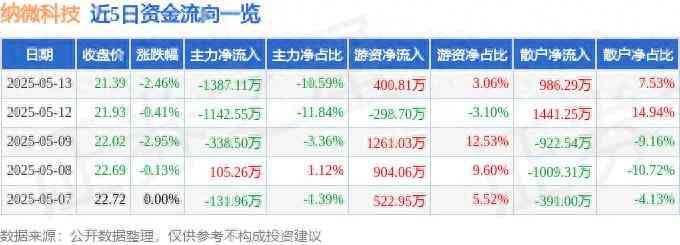 证券之星消息,截至2025年5月13日收盘,纳微科技(688690)报收于21.39元,下跌2.46%,换手率1.52%,成交量6.16万手,成交额1.31亿元。