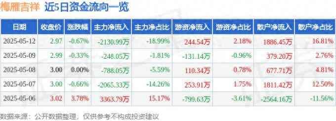 梅雁吉祥(600868)5月12日主力资金净卖出2130.99万元